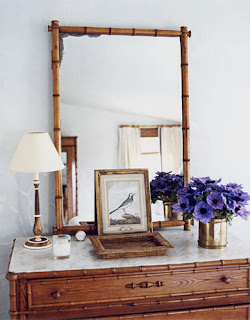 These marble-topped faux bamboo dressers are quite common, and I really liked the distressed quality of the mirror above. It has a very british colonial look. I love the simple quality of this vignette–straightforward and uncluttered, and the pop of color from the vase full of flowers.