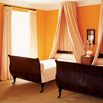 And finally, wall to wall sisal, orange ticking on the beds, and pumpkin on the walls–how fabulous is this? Traditional and yet indirectly modern.