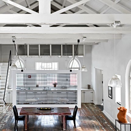 How cool is that screen that divides the kitchen space from the eating space? What this does is allow for the delineation of spaces without disrupting the experience of the architecture of the building. Oh how I adore these beams!