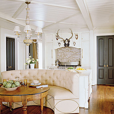 Don’t you just love the tufted banquette in this kitchen? Formality is all in the details here … the tufted banquette, the skinny double doors painted black with beautiful hardware, the antlers, the light fixture, the kitchen table … the list goes on. I just love this.