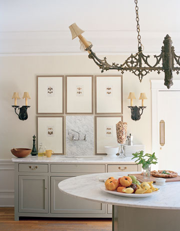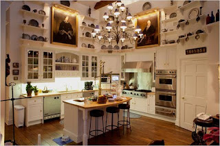I think that the formality of a kitchen can be dictated by artwork and light fixtures, such as in Joan Rivers kitchen above, or in the cabinet work and architectural details. I just love the idea that you are cooking underneath these two 19th century figures, looking down on you from their lofty portraits.