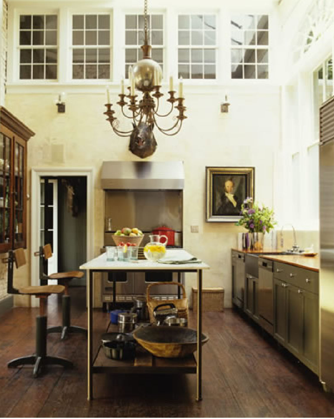 In an Amelia Handegan kitchen (see yesterday’s post), she not only uses a portrait on the wall (one of my pre-requisites for a formal kitchen), but she also uses dark wood cabinetry that mimics a secretary. Additionally, the kitchen sports an amazing formal chandelier … and a boar’s head for good measure. I absolutely cannot get enough of this kitchen.