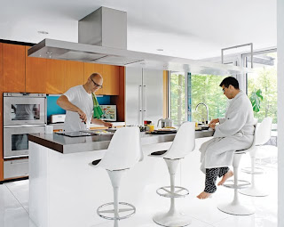 The most extensive changes to the house were probably made in the kitchen, where wood cabinetry was eliminated in favor of the sleek, ultra modern hood vent.