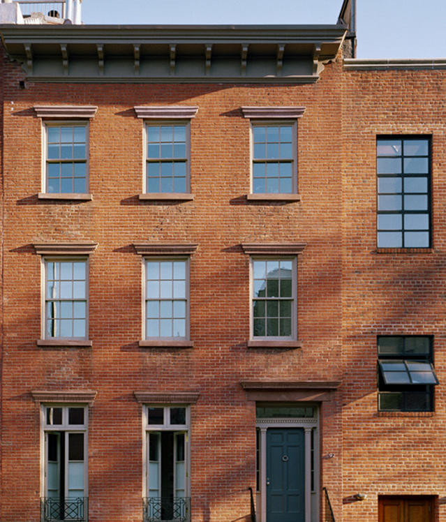 From the front, this Jane Street townhouse looks like many others on the block – beautiful 6 over 6 windows, french doors on the ground floor, and Greek Revival detailing. During the renovation, expert care was taken to restore the front of this house. On the back of the house, however, the architect took a different approach .