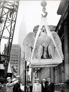 Interesting note: The eagle statue being hoisted up can now be found, along with 3 of his brothers, just outside of another magnificent train station: 30th Street in Philadelphia. There are two on either end of the Market Street Bridge.