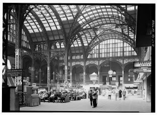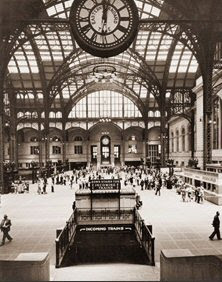 The waiting room, Pennsylvania Station. Can you imagine waiting for a train in this room? No wonder train travel was so chic. Within the station there were waiting areas for men and for ladies, as well as private clubs, restaurants, and bars.
