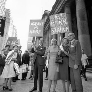 By the 1960s, train travel and the immense station had become outmoded. The space was not being used to its full capability, and the city began plans to tear down the station. Cries of outrage came from all over the city. Pictured here is Jane Jacobs, the famous preservation advocate (second from left), and Phillip Johnson, the famed modernist architect (far right), protesting the demise of the forgotten landmark.