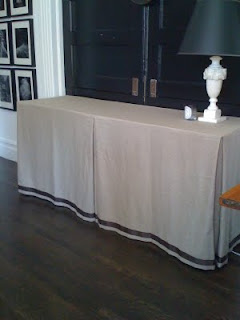 You could even add some grosgrain trim with your glue gun, like Grant Gibson did in his San Francisco Apartment. In his apartment he uses a table and skirt to hide things underneath … a little differently than my bookcase scheme, but in a similar vein! The moral of this story is that there is absolutely nothing that a good table skirt cannot hide. Period.
