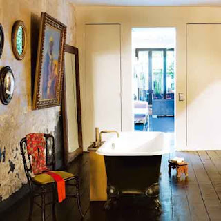 I love the juxtaposition of old and new in this bathroom, which could easily be a sitting room with the way it opens into the next room. The wall treatment, coupled with antique mirrors and paintings looks great against the more modern room that it opens into. Additionally, while the tub is footed, the fixtures are mounted in a modern way and have a contemporary feel.