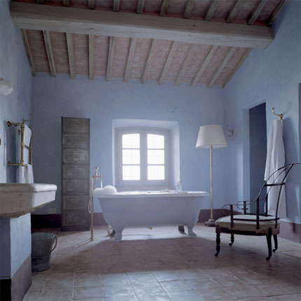 As a New Yorker, I am constantly blown away by bathrooms that resemble rooms other than the practical spaces that they are. Here in the city, and in Philadelphia for those of you who have seen the pictures of my teeny studio, a bathroom is a tiny closet with a small sink, shower, and toilet–without room for much else. For whatever reason, I feel that the ultimate in luxury would be to have a bathroom which feels less like a practical space, and more like a room you would want to spend time in.