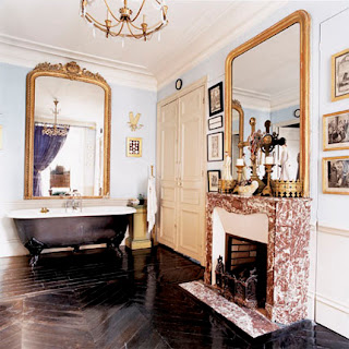 I love the juxtaposition of old and new in this bathroom, which could easily be a sitting room with the way it opens into the next room. The wall treatment, coupled with antique mirrors and paintings looks great against the more modern room that it opens into. Additionally, while the tub is footed, the fixtures are mounted in a modern way and have a contemporary feel.