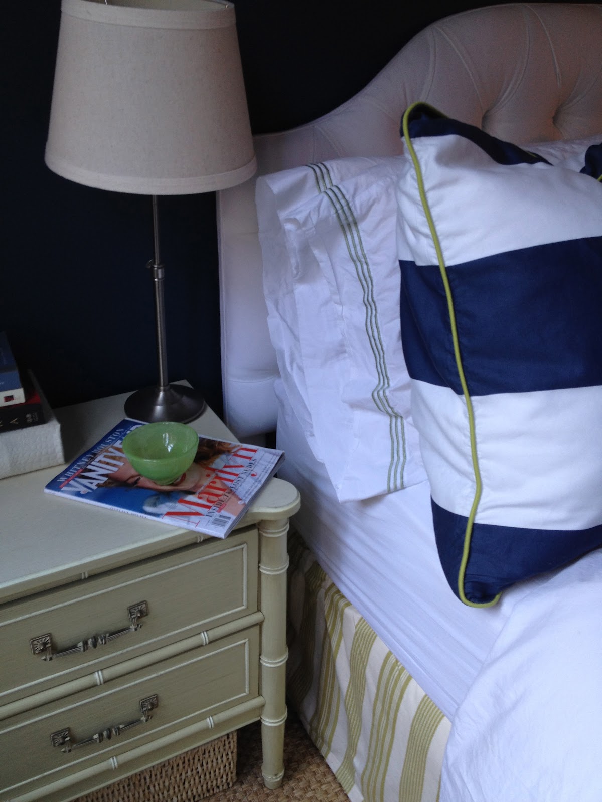 Remember last year, when I moved back from Philadelphia into WWB’s apartment and had to gender neutralize the bedroom? I posted about my concept in a post from last May called Going Green here. Well I realized my concept and added green accents to the otherwise masculine bedroom, and now we’re moving. I love what I did with this room, and I wish that there was a way to take it with me.