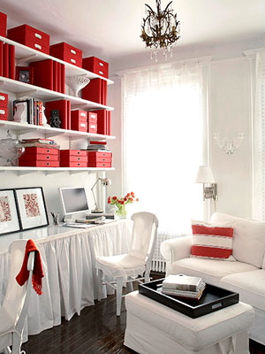 Again, red desk accessories add a bright touch to this white office. I am very jealous of this person’s organizational abilities!