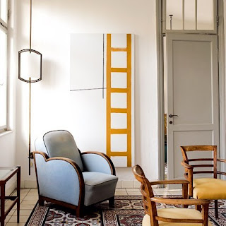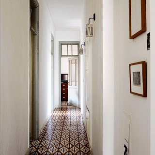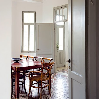 What I love about these rooms is that the decor is totally paired down so that the architecture, and namely the beautiful tile floors, speak for themselves. There are very few pieces of furniture in each room, and there are very few pieces of art on the walls–because the tile floors are all the color and interest that the rooms need. Additionally, I love the idea of painting walls white, and painting the trim a contrasting color. So often we see colored, upholstered or painted walls and glossy white trim, and I love the historic nature of painted trim and white walls.