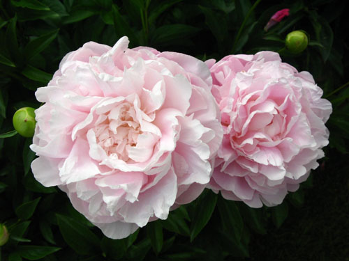 Everywhere I look I see pale pink peonies!–and I absolutely adore them. Not the dark pink, not any other color, simply the pale pink, almost white, peonies. At the wedding I attended in Charleston two weeks ago, peonies were the flower in the table arrangements, and they looked so beautiful.