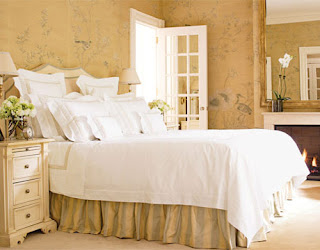 In this bedroom, the french door to the bathroom has mirrored panes. I think this is a lovely idea, especially when the door is open as it is here. It reflects the light coming in from the bathroom, creating a wonderful affect.  I also see a mirrored french door working well at the end of a hallway in an apartment, perhaps separating the private living spaces from the more public entertaining rooms. Knowing my pension for pocket doors, I would also double french doors with mirrored panes separating two rooms such as a living room and dining room or study.