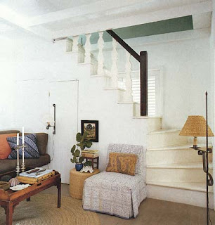 The low ceiling, round seagrass area rug, and louvered shutter in the stairwell are all elements that I would love to include in a beach house. There is also something about this space that is not over-thought. That is exactly how I would do a beach house–without overthinking the decorating. Just let the house be the house, and a great place to relax and enjoy time with friends–comfortable chairs and great pillows. I love the dark wood of the newel post and hand rail on the stairs.