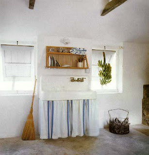 Who doesn’t love an old farm sink with wall mounted fixtures and a blue and white striped skirt?