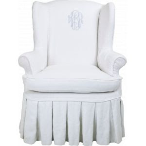 Something about the latent formality in a wing chair, coupled with the casual and flirty nature of a skirt, looks perfect at the head of a table. Below are some options for skirted wing chairs.